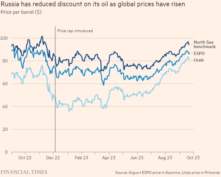 Мало того, что более высокая доля российской нефти продается за пределами лимита, но и растущая независимость Москвы как продавца совпала с сильным ростом цен на нефть, которые на той неделе превысили 95 долларов за баррель впервые за 13 месяцев.