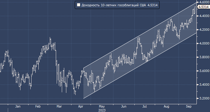 На торгах в понедельник доллар показал рекордный за три недели рост против основных валют, благодаря чему индекс доллара BBDXY достиг годового максимума. Сила американской валюты объясняется намерением ФРС удерживать процентные ставки высокими дольше, нежели полагал рынок до публикации обновленного прогноза членов FOMC 20 сентября. На этом фоне сегодня доходности 10- и 30-летних гособлигаций США достигли свежих многолетних максимумов.