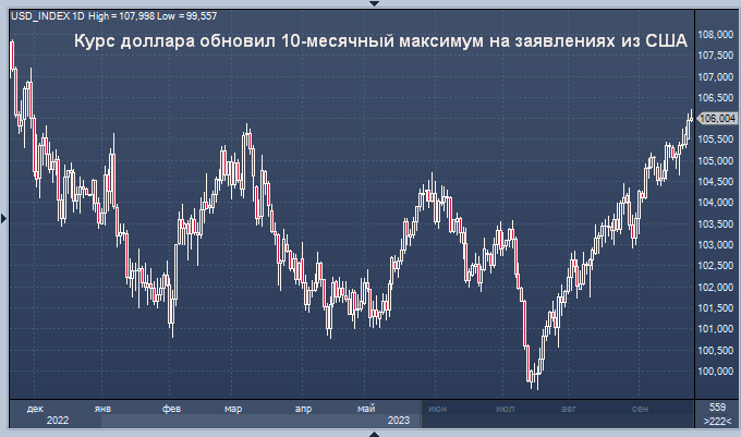 Более высокая доходность облигаций США усилила привлекательность доллара, подняв индекс доллара до 106,2, самого высокого уровня с конца ноября 2022 года. Индекс, который отслеживает курс валюты по отношению к шести основным аналогам, в последний раз ърос на 0,11% до 106,07.