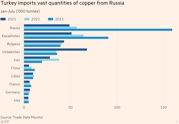 По данным Trade Data Monitor, импорт российской меди в Турцию увеличился почти в три раза до 159 000 тонн за первые семь месяцев 2023 года по сравнению с тем же периодом годом ранее. На долю этого приходится треть импорта страны красного металла.