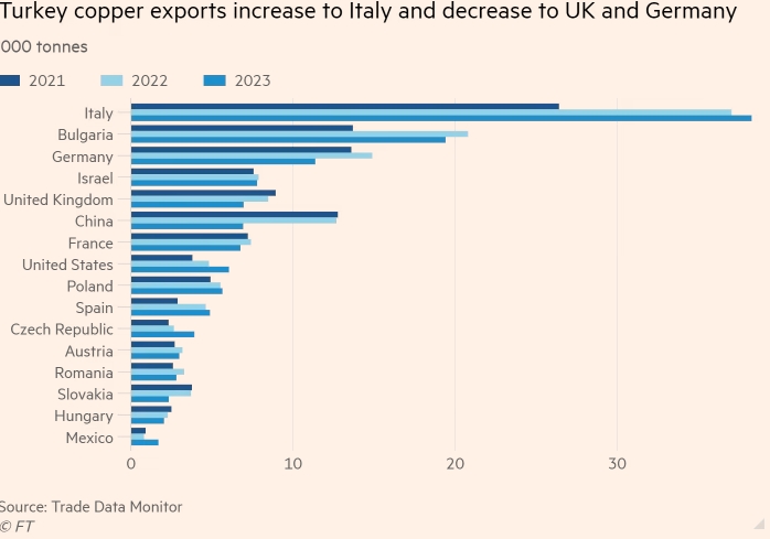 Италия стала крупнейшим направлением экспорта меди из Турции, рост которого в этом году составил 3 процента, по сравнению с резким падением в Германии и Великобритании. Это указывает на то, что Италия становится неотъемлемой частью торгового пути для российской меди, считают эксперты.