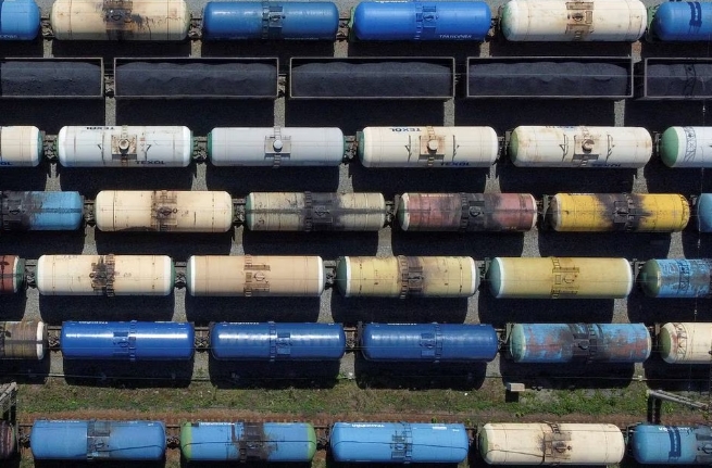 Вид с воздуха: нефтяные цистерны и грузовые железнодорожные вагоны в Омске, Россия, 24 мая 2022 года. Снимок сделан с помощью дрона. REUTERS/Алексей Мальгавко