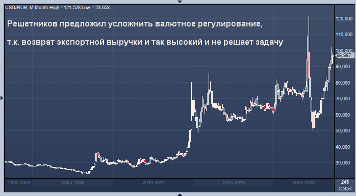 Система валютного регулирования должна быть сложнее и включать анализ тех объемов рублевой массы, которые остаются за рубежом, заявил руководитель Минэкономразвития РФ Максим Решетников в ходе Московского финансового форума, подчеркнув, что изменения ключевой ставки и возврата валютной выручки для влияния на курс недостаточно, в том числе, потому что крупнейшие компании уже сейчас возвращают на рынок РФ порядка 85%.
