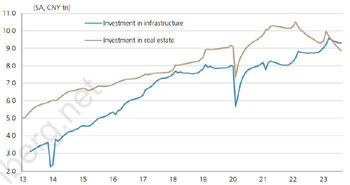 Китай: инвестиции в инфраструктуру (синим) и недвижимость (коричневым) в трлн юаней. Источник: Bloomberg