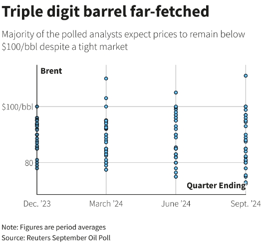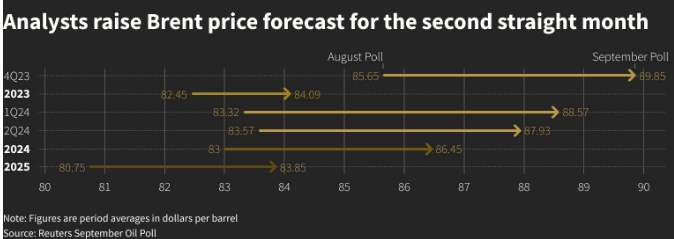 Опрос 42 экономистов и аналитиков показал, что цена на нефть марки Brent, которая в настоящее время держится чуть выше 95 долларов за баррель, составит в среднем 84,09 доллара за баррель в 2023 году, по сравнению с августовским прогнозом в 82,45 доллара.