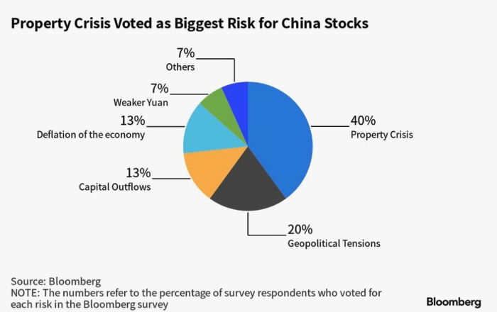 Сектору недвижимости Китая еще предстоит пережить худшие последствия кризиса, который омрачил экономику страны и способствовал оттоку глобальных инвестиций со второго по величине фондового рынка в мире. Таково мнение 9 из 15 респондентов в неофициальном опросе Bloomberg аналитиков и финансовых менеджеров Гонконга и Китая. Шесть из них назвали проблемы с жильем самым большим риском для акций в последнем квартале 2023 года.