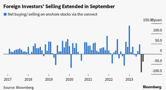 Зарубежные инвесторы продали акции материкового Китая на нетто-основе на сумму около 37 млрд юаней (5,1 млрд долларов) в сентябре после рекордной распродажи на 90 миллиардов юаней в августе.