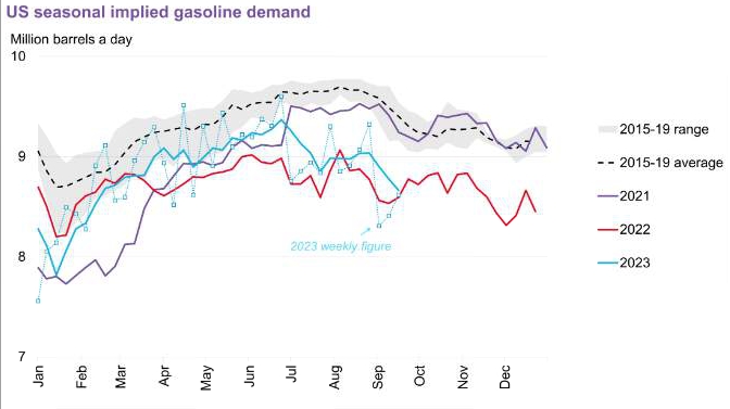 Потребление возвращается к сезонному значению 2022 года впервые с июля и на 740 тыс. баррелей в день ниже среднего показателя за 5 лет в период до пандемии.