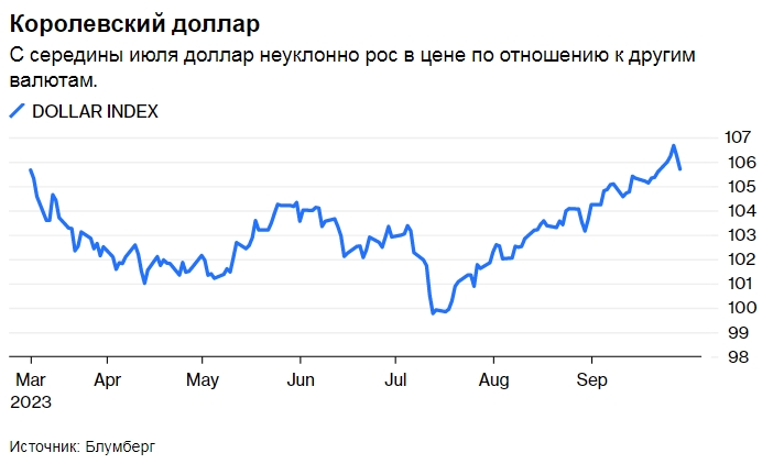 Король доллар. С середины июля доллар неуклонно рос в цене по отношению к другим валютам. Источник: Блумберг