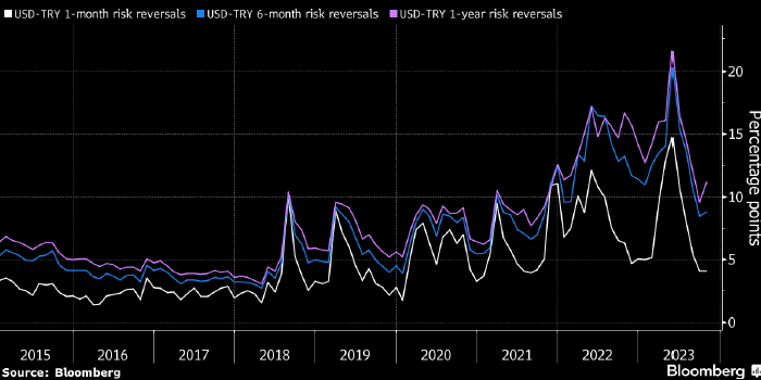 1- (белым), 6- (голубым) и 12-месячные «risk reversals» на USDTRY в %. Источник: Bloomberg