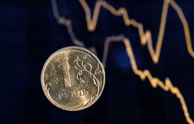 На этом иллюстративном снимке, сделанном 22 августа 2023 года, перед экраном изображена российская монета достоинством в один рубль. REUTERS/Максим Шеметов