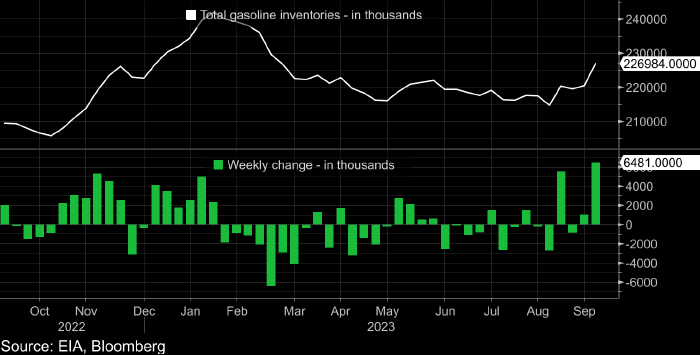 Сегодня дополнительное давление на рынок оказала публикация данных по коммерческим запасам сырой нефти и нефтепродуктов от Минэнерго США. Из отчета выяснилось, что на неделе до 29 сентября запасы бензина в стране подскочили на 6,481 млн баррелей, что стало рекордным значением с января 2022 года.