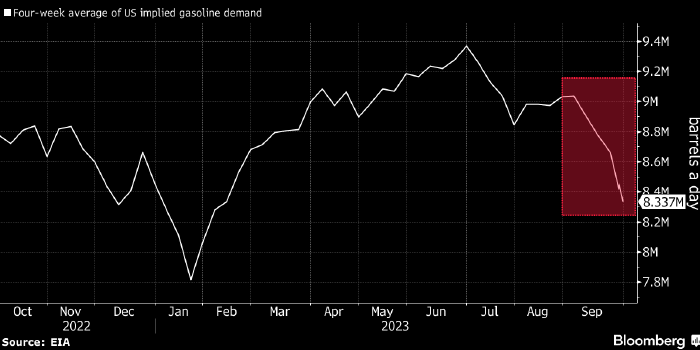 Кроме того, среднее четырехнедельное значение подразумеваемого спроса на бензин опустилось до самого низкого за 25 лет уровня для этого времени года (см. график ниже).