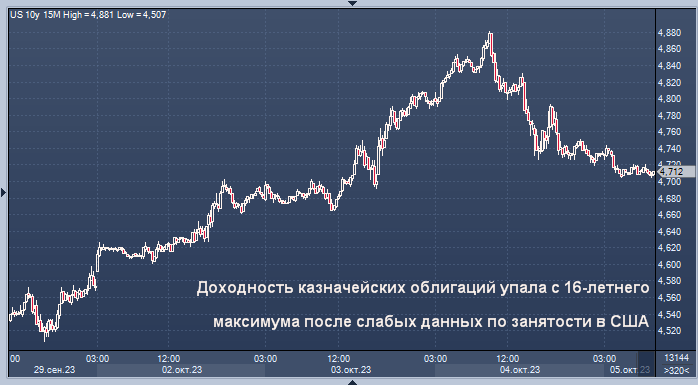 Доходность облигаций по обе стороны Атлантики упала после того, как в среду достигла самого высокого уровня более чем за десятилетие, поскольку слабые данные по рынку труда США помогли ослабить обеспокоенность инвесторов по поводу фразы Федеральной резервной системы о процентных ставках «выше и дольше».