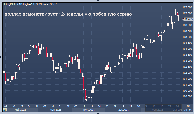 Индекс доллара, который ранее на этой неделе достиг примерно 11-месячного максимума в 107,34, в последний раз задержался на отметке 106,43, но демонстрировал впечатляющее ралли: 12 недель роста подряд. В последний раз он достиг такого рубежа в 2014 году.