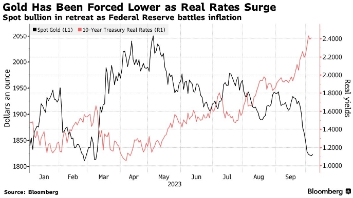 Достигнув отметки в 2000 долларов за унцию совсем недавно, в мае, золото затем продемонстрировало последовательные квартальные потери, сведя на нет прошлогодний рост. На этой неделе спотовые слитки достигли самого низкого уровня с марта и в последний раз торговались по цене около $1822 за унцию.