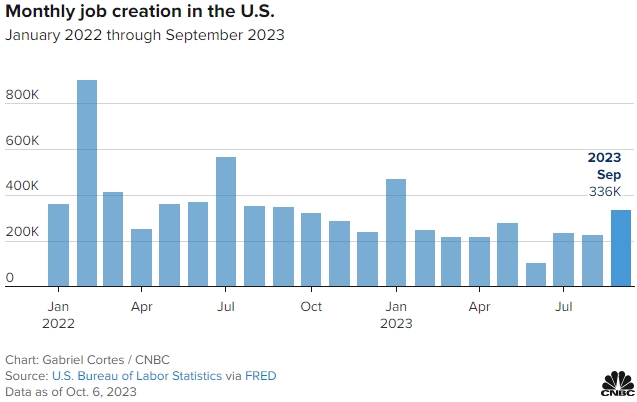 Данные Бюро статистики труда показали, что работодатели США в сентябре создали 336 000 новых рабочих мест. Это ознаменовало собой резкий шаг вперед по сравнению с августовским показателем, который был пересмотрен на 40 000 до 227 000. Экономисты, опрошенные Bloomberg, ожидали, что сентябрьский показатель составит 170 000.