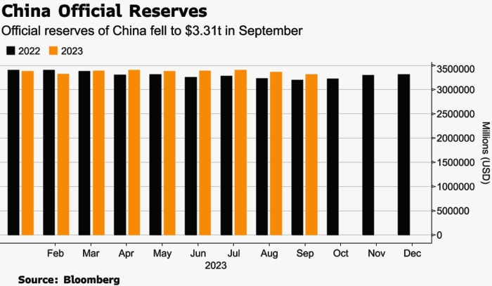 Резервы Китая — крупнейшие в мире — упали на $45 млрд до $3,115 трлн в прошлом месяце по сравнению с $3,13 трлн, прогнозируемыми аналитиками в опросе Reuters. В августе резервы составляли $3,16 трлн.