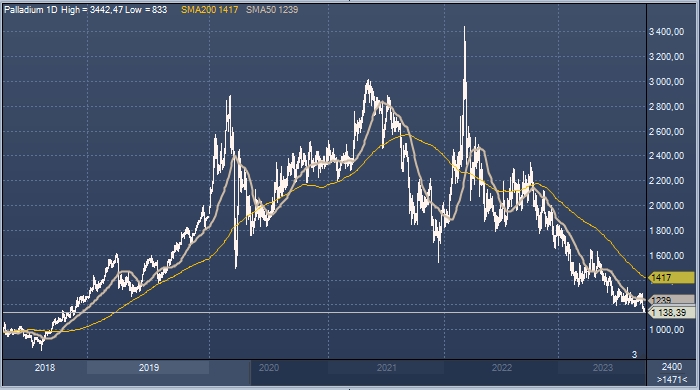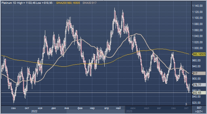 Палладий упал на прошлой неделе до пятилетнего минимума около $1138,4 за унцию. Цены на платину, крупнейшим поставщиком которой является Южная Африка, достигали минимума с сентября 2022 г. в районе $852,65 за унцию.