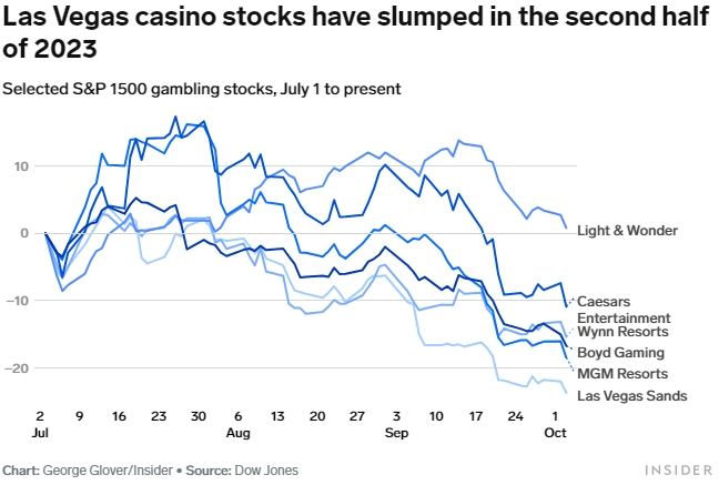 Базовый индекс упал на 8% с 31 июля из-за опасений инвесторов, что Федеральная резервная система будет дольше удерживать процентные ставки на более высоком уровне, чтобы остановить инфляцию, в то время как индекс S&P Composite 1500 Casinos & Gaming Index, который отслеживает стоимость акций 10 компаний, котирующихся на бирже в США, упали на 19% за тот же период.