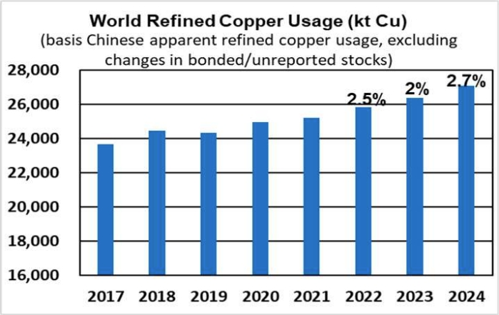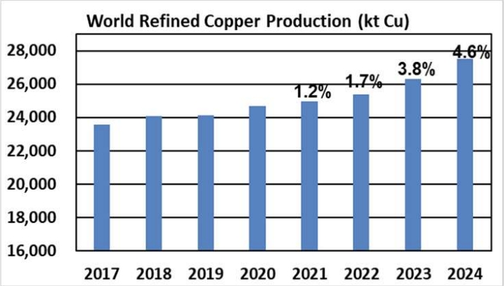 Ожидаемый в следующем году рост потребления все еще будет ниже скачка мирового производства рафинированной меди (+4,6%).