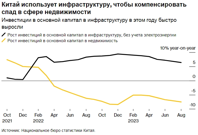 Китай использует инфраструктуру, чтобы компенсировать спад в сфере недвижимости. Инвестиции в основной капитал в инфраструктуру в этом году быстро выросли. Источник: Национальное бюро статистики Китая.