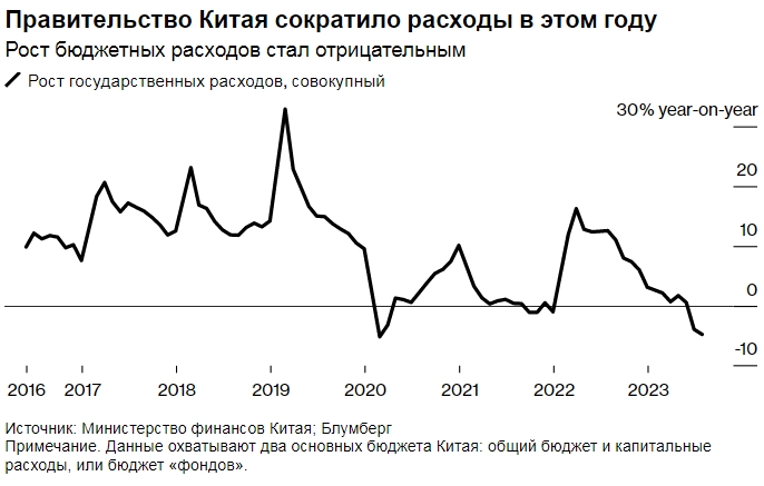 Правительство Китая сократило расходы в этом году. Рост бюджетных расходов стал отрицательным. Источник: Министерство финансов Китая; Блумберг. Примечание. Данные охватывают два основных бюджета Китая: общий бюджет и капитальные расходы, или бюджет «фондов».