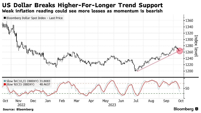Спотовый индекс доллара Bloomberg падает седьмой день подряд после того, как недавние комментарии представителей Федеральной резервной системы, включая Кристофера Уоллера, дали основания предполагать, что чиновники могут воздержаться от дальнейшего ужесточения политики. Индекс повышался два квартала подряд и на прошлой неделе достиг самого высокого уровня почти за год благодаря ставкам на то, что процентные ставки в США могут оставаться высокими еще долгое время.