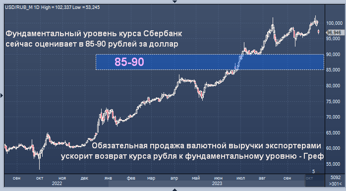Требование об обязательной продаже валютной выручки крупными экспортерами ускорит возвращение курса рубля к фундаментальному уровню, но базово на валютный рынок оказывают влияние другие факторы, рассказал президент - председатель правления Сбербанка Герман Греф.