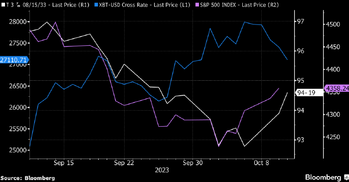 Во второй половине сентября доходности гособлигаций США заметно выросли, и на этом фоне биткоин показал гораздо более сильную динамику, чем S&P 500. Затем доходности трежерис начали снижаться, биткоин подешевел, а рынок акций США подрос.
