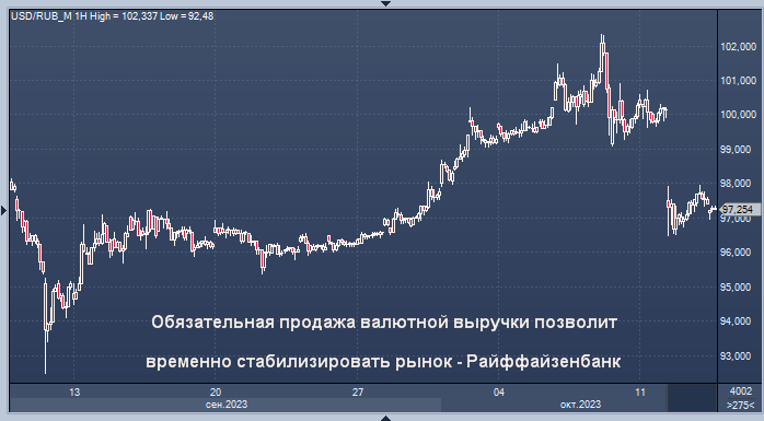 "После объявления в среду вечером о подписании Указа об обязательной продаже валютной выручки отдельными компаниями, рубль начал искать новое локальное равновесие вблизи 97 руб./$1. На наш взгляд, необходимость такой меры во многом продиктована понизившейся ликвидностью валютного рынка. Ее цель - снижение волатильности курса рубля и сокращение лага в реакции курса на поступление валютной выручки", - пишут аналитики Райффайзенбанка.
