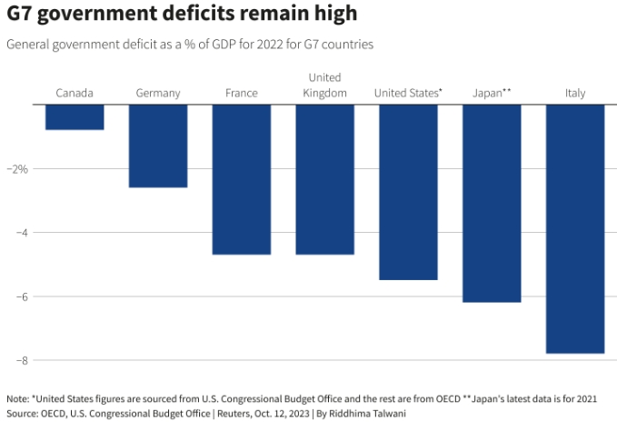 Долг близок или превышает 100% объема производства в Великобритании, Соединенных Штатах и Италии. Старение населения, изменение климата и геополитические риски, такие как конфликт на Украине и Ближнем Востоке, означают значительное увеличение расходов в будущем.