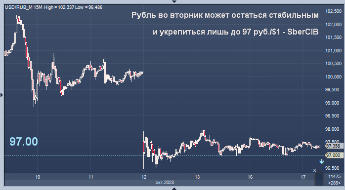 Рубль во вторник может остаться стабильным и укрепиться лишь до 97 руб./$1, поскольку до налоговых выплат еще две недели, а новых значимых факторов пока нет, отмечают в инвестбанке.