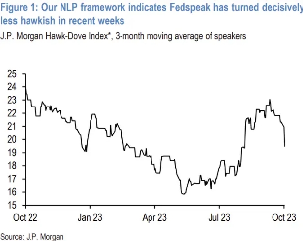 На графике показано значительное снижение индекса JPMorgan Hawk-Dove, который в конечном итоге отражает настроения ФРС.