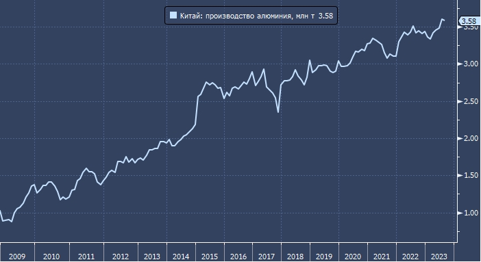 Производство первичного алюминия в Китае в сентябре выросло, по данным Национального бюро статистики КНР, на 5,3% по сравнению с сентябрем 2022 года до 3,58 млн тонн. КНР — мировой лидер по объему производства этого металла.