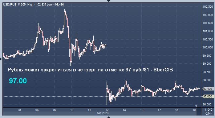 Рубль может закрепиться в четверг на отметке 97 руб./$1, а котировки нефти Brent, скорее всего, удержатся около $91 за баррель, пишут эксперты SberCIB Investment Research.