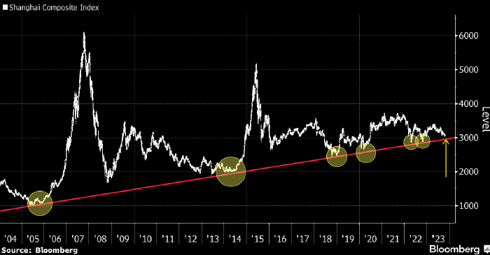 Стратеги Bloomberg называют эту восходящую поддержку «линией судьбы», указывая, что результаты ее теста могут определить динамику рынка акций Китая на долгосрочную перспективу. Этот тренд действительно выглядит очень важным, т. к. он не был пробит ни во время экономического спада 2014 года, ни во время начала торговой войны между США и Китаем при Трампе, ни во время пандемии Covid-19.