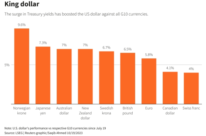 Доллар США вырос в среднем примерно на 6,4% по отношению к своим аналогам из G10, поскольку рост доходности казначейских облигаций ускорился в середине июля. Индекс доллара, который измеряет силу доллара по отношению к шести основным валютам, находится вблизи 11-месячного максимума.