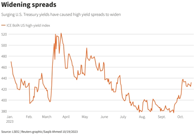 По мере роста доходности казначейских облигаций спреды на кредитном рынке расширились, поскольку инвесторы требуют более высокой доходности по более рискованным активам, таким как корпоративные облигации. Кредитные спреды резко расширились после банковского кризиса в этом году, а затем сузились в последующие месяцы.