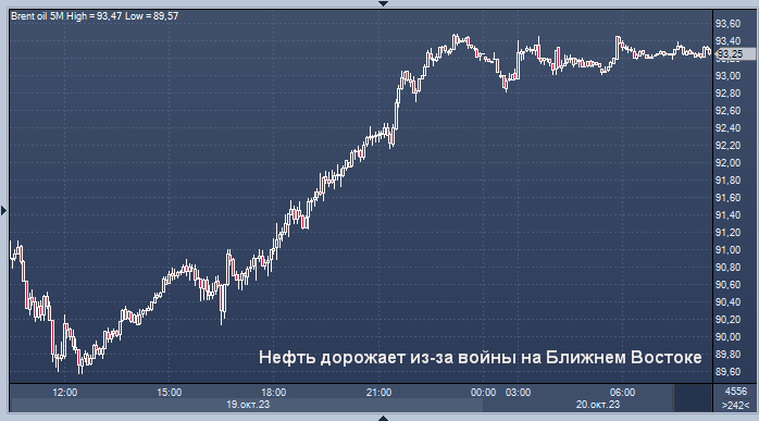 Мировой эталонный сорт Brent поднялся выше 93 долларов за баррель, а нефть West Texas Intermediate приблизилась к 91 доллару. США наблюдают усиление атак беспилотников в Ираке и Сирии, сообщил Пентагон, в то время как американский эсминец перехватил крылатые ракеты, выпущенные по Израилю повстанцами-хуситами в Йемене. Кроме того, ожидается, что Израиль начнет наземное вторжение в Газу после сосредоточения войск на границе.