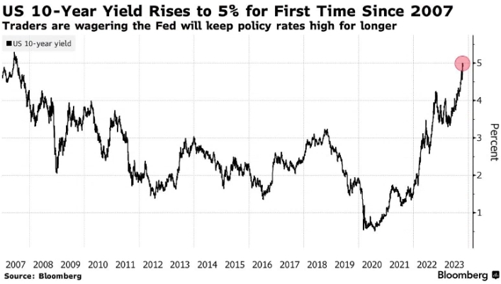 Доходность 10-летних казначейских облигаций превысила 5% впервые за 16 лет, чему способствовали ожидания того, что Федеральная резервная система сохранит повышенные процентные ставки и что правительство будет и дальше увеличивать продажи новых облигаций для покрытия растущего дефицита.