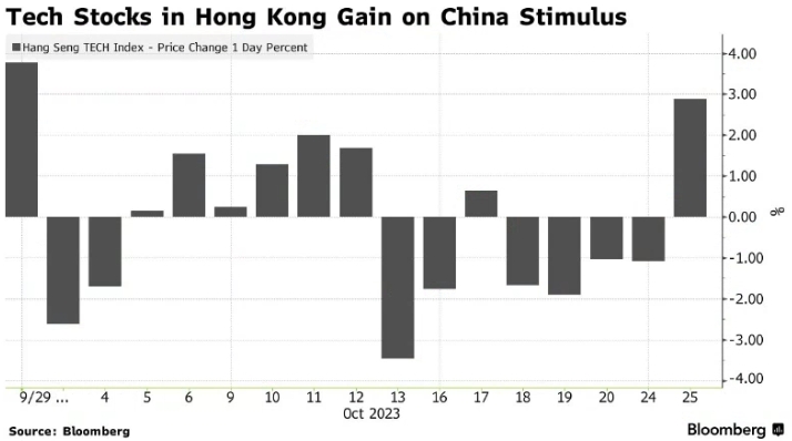 Индекс Hang Seng Tech подскочил больше всего с конца августа на фоне планов поддержки правительства КНР, которые включают выпуск дополнительных суверенных долговых обязательств и повышение коэффициента дефицита бюджета. В то же время Гонконг отменяет экстренное повышение гербового сбора на биржевые торги, поскольку чиновники стремятся восстановить статус города как центра финансов и первичных публичных размещений акций.