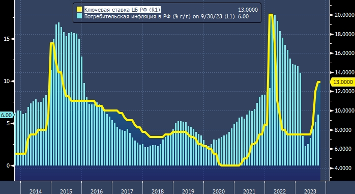 "С одной стороны, текущие инфляционные ожидания и укрепление курса рубля скорее свидетельствуют в пользу повышения ставки на 50 б.п., однако мы полагаем, что снижение инфляционных ожиданий в октябре не будет служить веским аргументом для ЦБ РФ при принятии решения по ставке на ближайшем заседании.