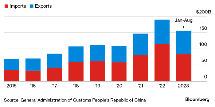 По подсчетам Bloomberg, на долю Китая приходится около 20% всего российского импорта, тогда как доля Китая в импорте США сократилась с 22,3% в начале 2017 года до 13,8% в этом августе. С начала 2023 года Китай экспортировал в РФ товары на $81,5 млрд, что превышает показатель всего 2021 года. Поставки российских товаров в Китай выросли в этом году на 13% г/г.