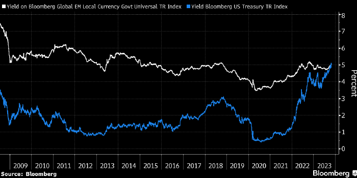 На мировом рынке облигаций произошло невиданное событие: доходность гособлигаций США превысила доходность гособлигаций развивающихся стран, номинированных в их национальных валютах. Распродажа на рынке госдолга США спровоцировала рост средней доходности трежерис в область 5%, тогда как средняя доходность локального госдолга стран EM колеблется в этой области уже больше года (см. график выше).