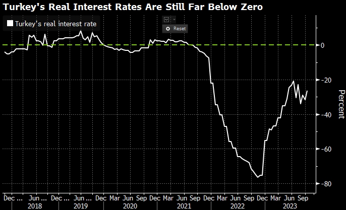 Турецкие чиновники, такие как Симсек, в последние недели заявляли, что денежно-кредитная политика является более жесткой, чем предполагает общий уровень ставок, призывая инвесторов сосредоточиться на доходности депозитов по сравнению с прогнозируемой инфляцией.