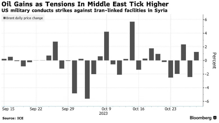 Нефть выросла, когда США нанесли удары по двум связанным с Ираном объектам в Сирии, что вновь усилило опасения инвесторов о том, что война между Израилем и ХАМАС может спровоцировать более широкий конфликт и нарушить поставки сырой нефти.