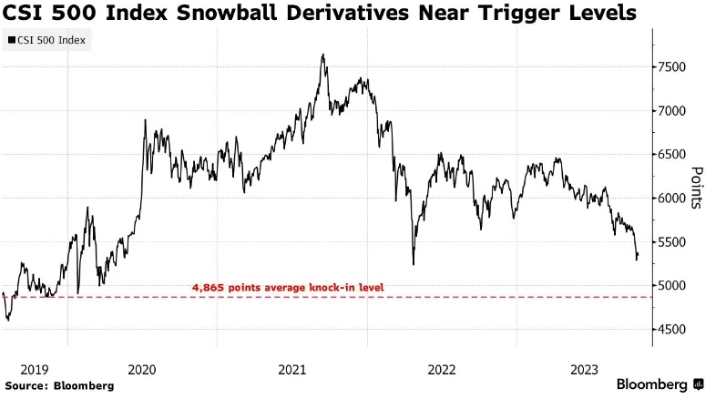 Инвесторы сталкиваются с потерями в сложных деривативах типа «снежный ком» (Snowballs) при погашении, когда эталонный показатель падает ниже так называемого уровня нокдауна (knock-in level). По оценкам China International Capital Corp, для тех, кто привязан к индексу CSI Smallcap 500, средний порог составляет 4865. По состоянию на 9:52 утра пятницы этот показатель торговался на отметке 5417.