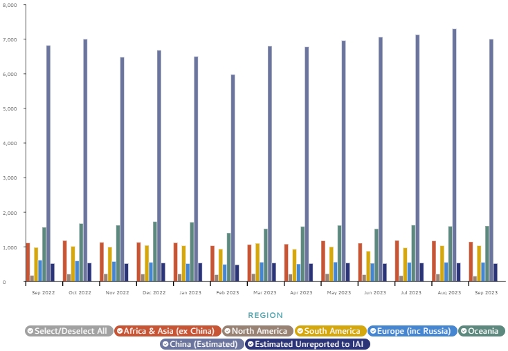 Международный институт алюминия: помесячные данные по производству глинозема в разных регионах мира.