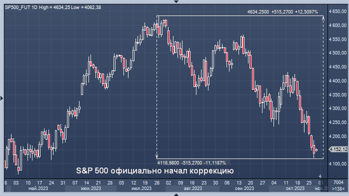 Фондовый индекс S&P 500 упал более чем на 10 процентов по сравнению с высшей точкой, которой он достиг ранее в этом году, что соответствует популярному определению рыночной «коррекции», поскольку инвесторы беспокоятся о процентных ставках, геополитических рисках и посредственных результатах компаний в третьем квартале.